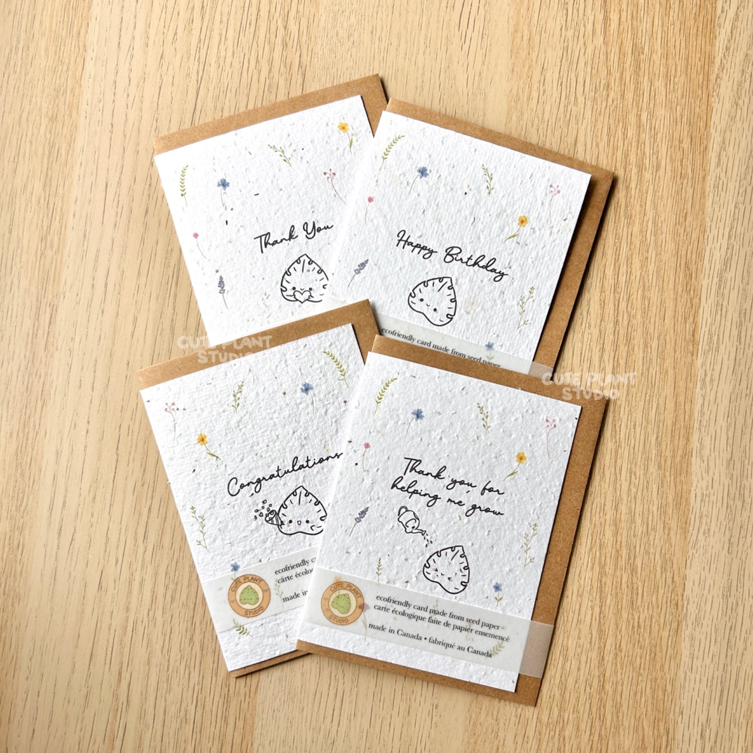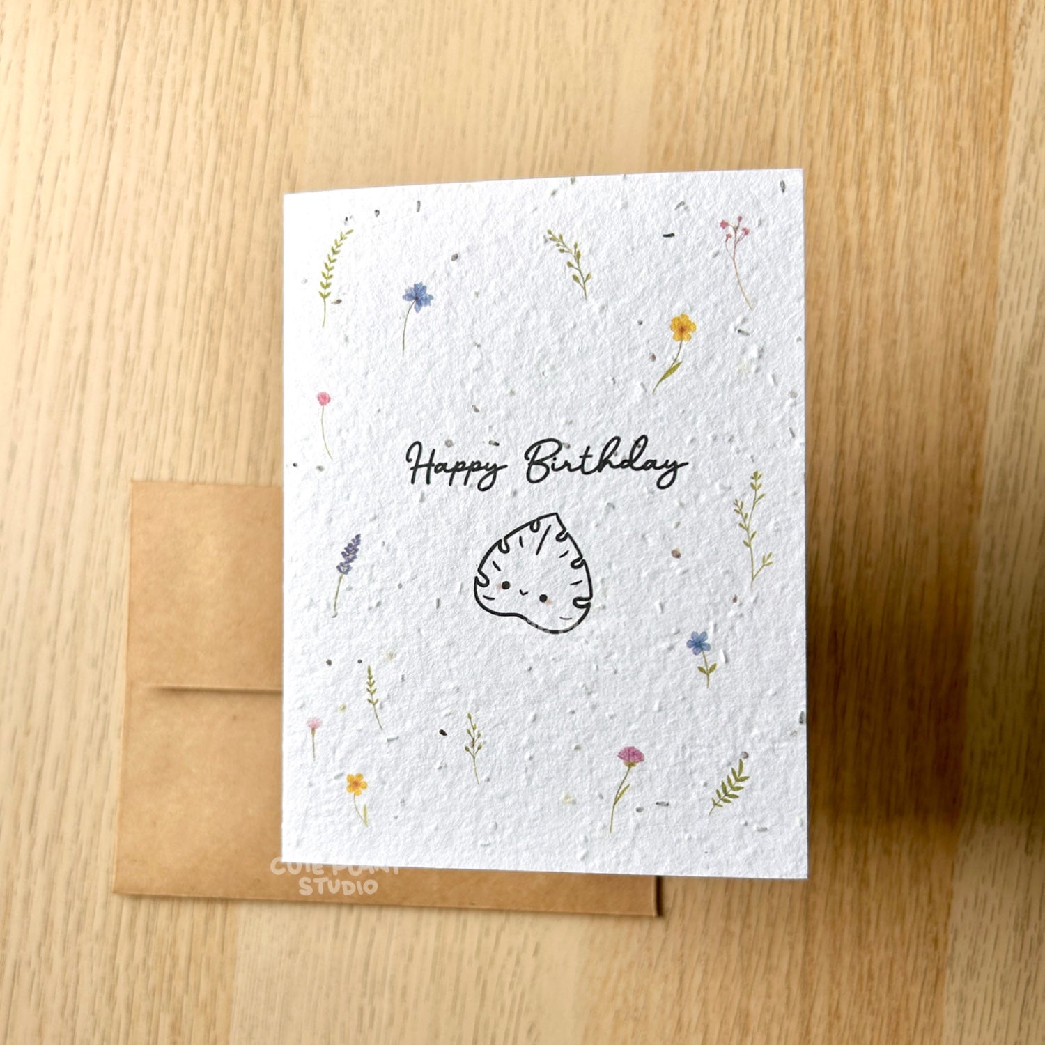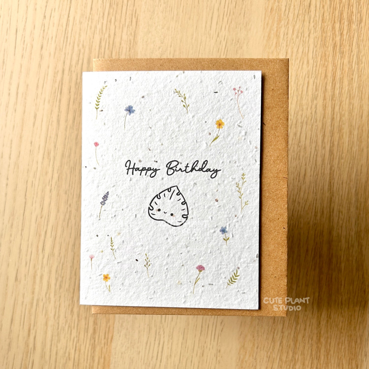 Each card features illustrated pressed flowers and your favourite monstera friend in a sweet little moment that matches the occasion. Printed on biodegradable wildflower seed paper, these cards not only send a message, but also grow into something beautiful. A soft, minimalist design makes each one feel warm and intentional, whether you're expressing thanks, celebrating growth, or just sending a leafy hug. Each card comes with a kraft paper envelope and grows wildflowers when planted; because your words should bloom long after they're read. Standard A2 cardstock size (4.25 x 5.5" when folded).