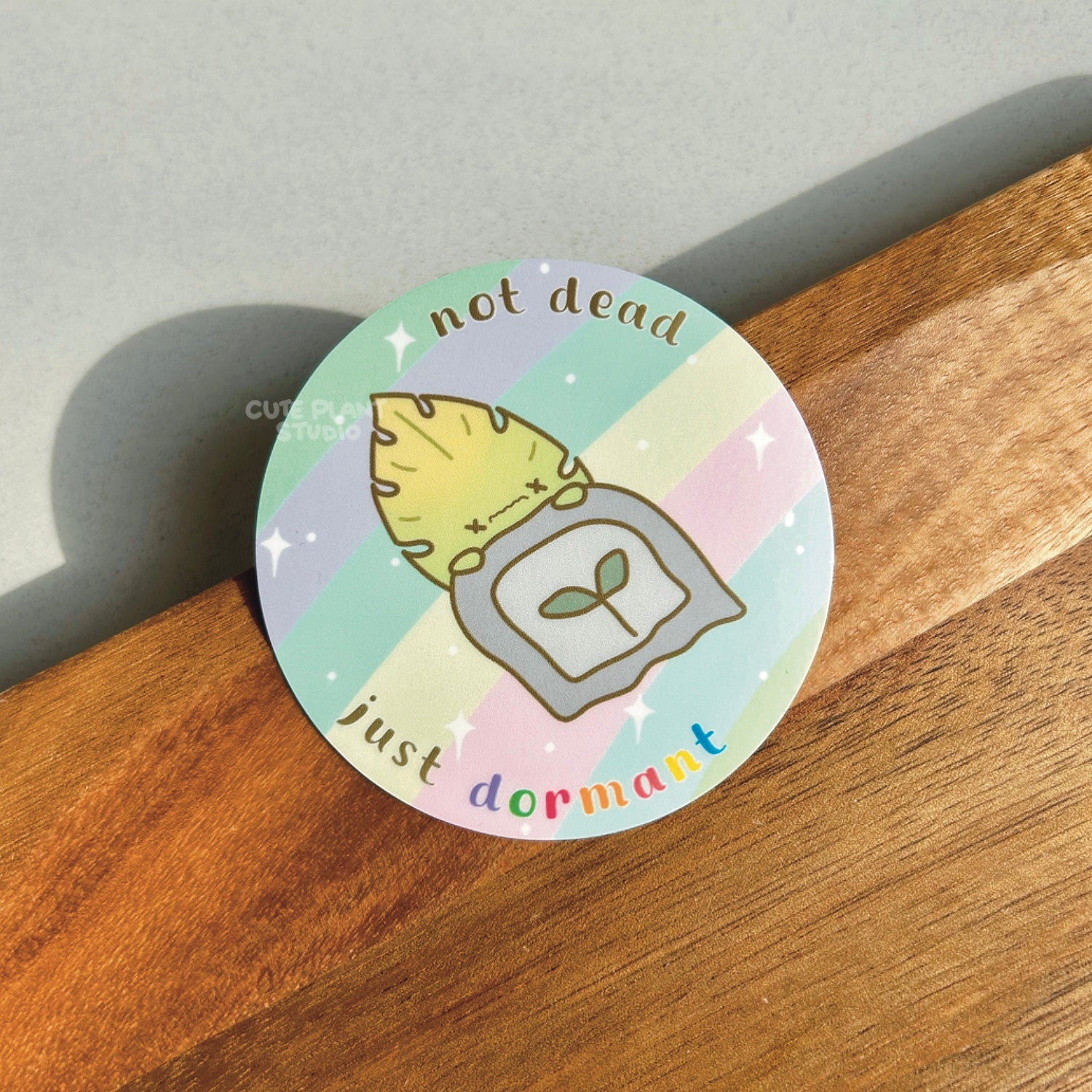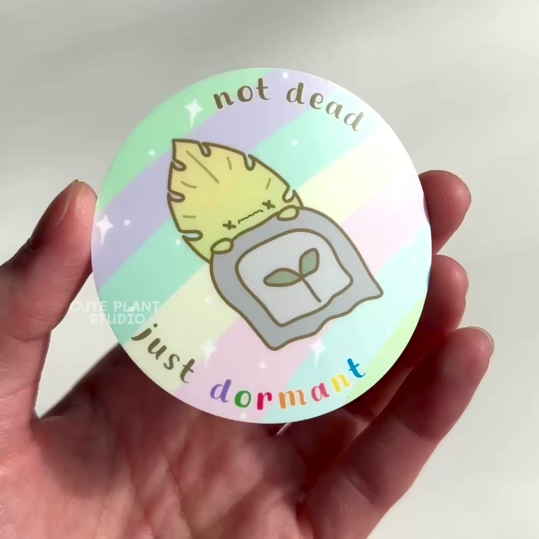 A little dramatic? Maybe. Still alive? Definitely. This sticker features a sleepy leaf tucked under a tombstone-shaped blanket...a funny and comforting reminder that even plants (and people) need rest. Perfect for wintering leaves, burnout recovery, or your favourite plant parent’s mood board. Waterproof, weatherproof, and made from sustainable materials. Approximately 2.5" (6.35 cm) in diameter.