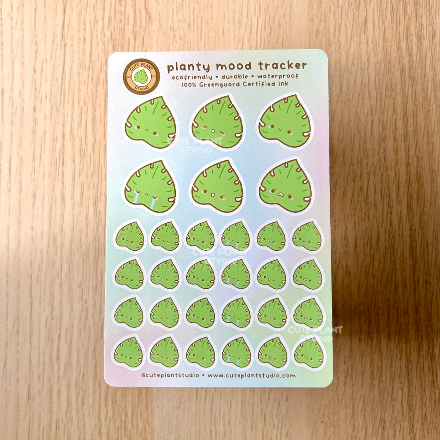 Whether you're journaling, planning, or decorating your laptop, this mood tracker sheet adds a touch of self-expression to your day. This sheet features six different monstera leaf moods. The waterproof vinyl sticker sheet includes one large version of each expression and several mini ones to sprinkle throughout your notebooks, calendars, or phone cases. Designed to be both functional and adorable, it's your leafy little companion for tracking the ups, downs, and everything in between. 4 x 6" large (approx. 10 x 15 cm)