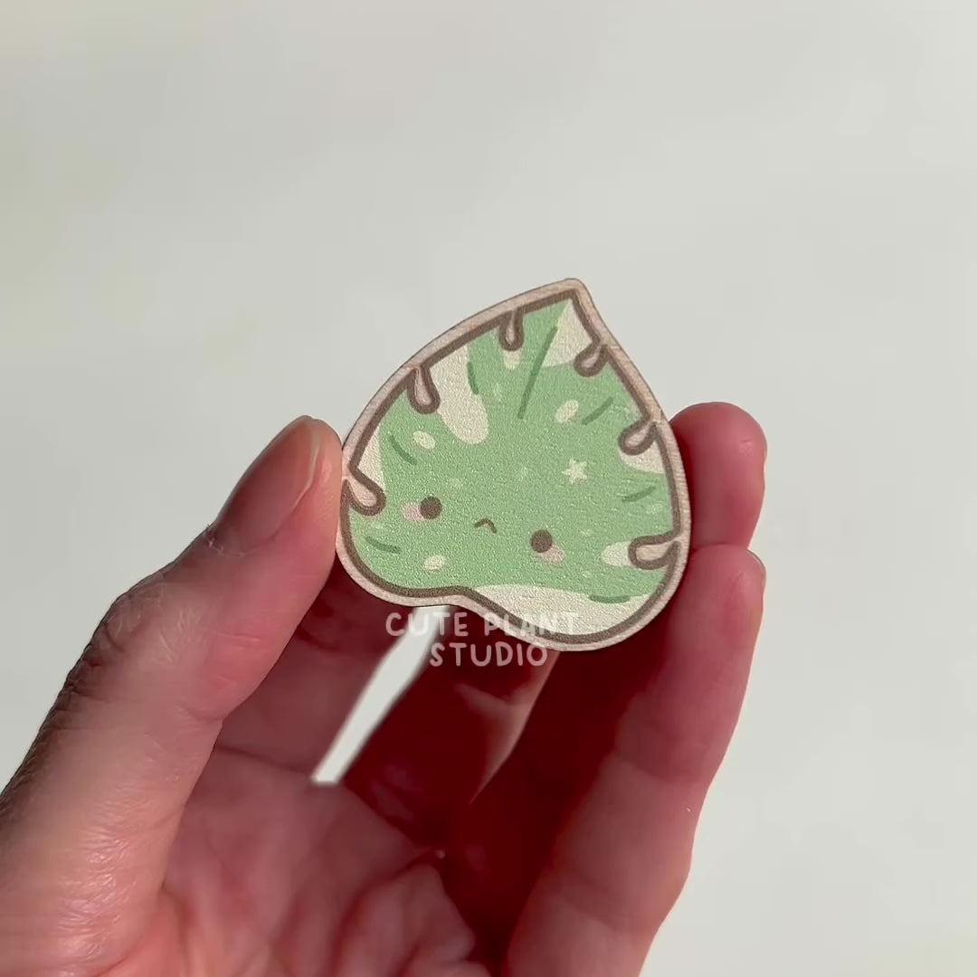 Brighten up your collection with this eco-friendly Thai Constellation wooden pin! Featuring our cute little leaf character with its signature cream and green variegation, this 35mm (1.4-inch) pin is the perfect accessory for fans of rare monstera plants. Add it to your bag, jacket, or hat for a sustainable and stylish touch that celebrates your love for plants in the most adorable way.