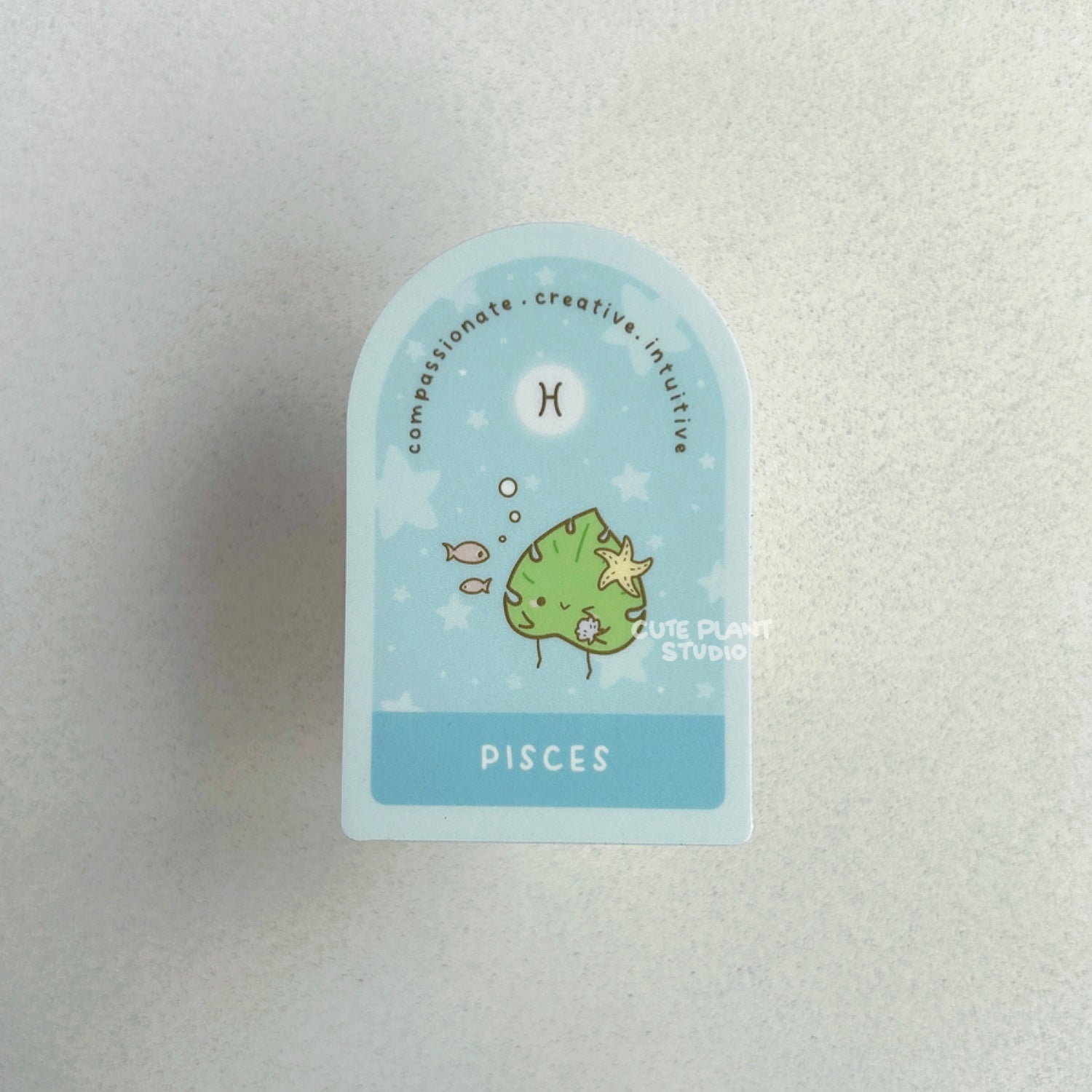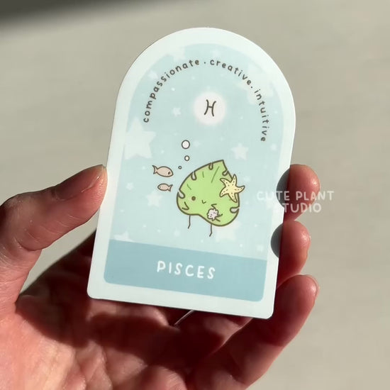 Dreamy and intuitive, our cute little Pisces leaf is underwater with its fishy friends, capturing the magic of this water sign. This eco-friendly zodiac sign sticker is approximately 3" (7.6cm) tall and is a fun way to express your horoscope pride! Durable, scratch-resistant, and waterproof, it's perfect for laptops, water bottles, or journals. A unique gift for houseplant parents and astrology fans alike!