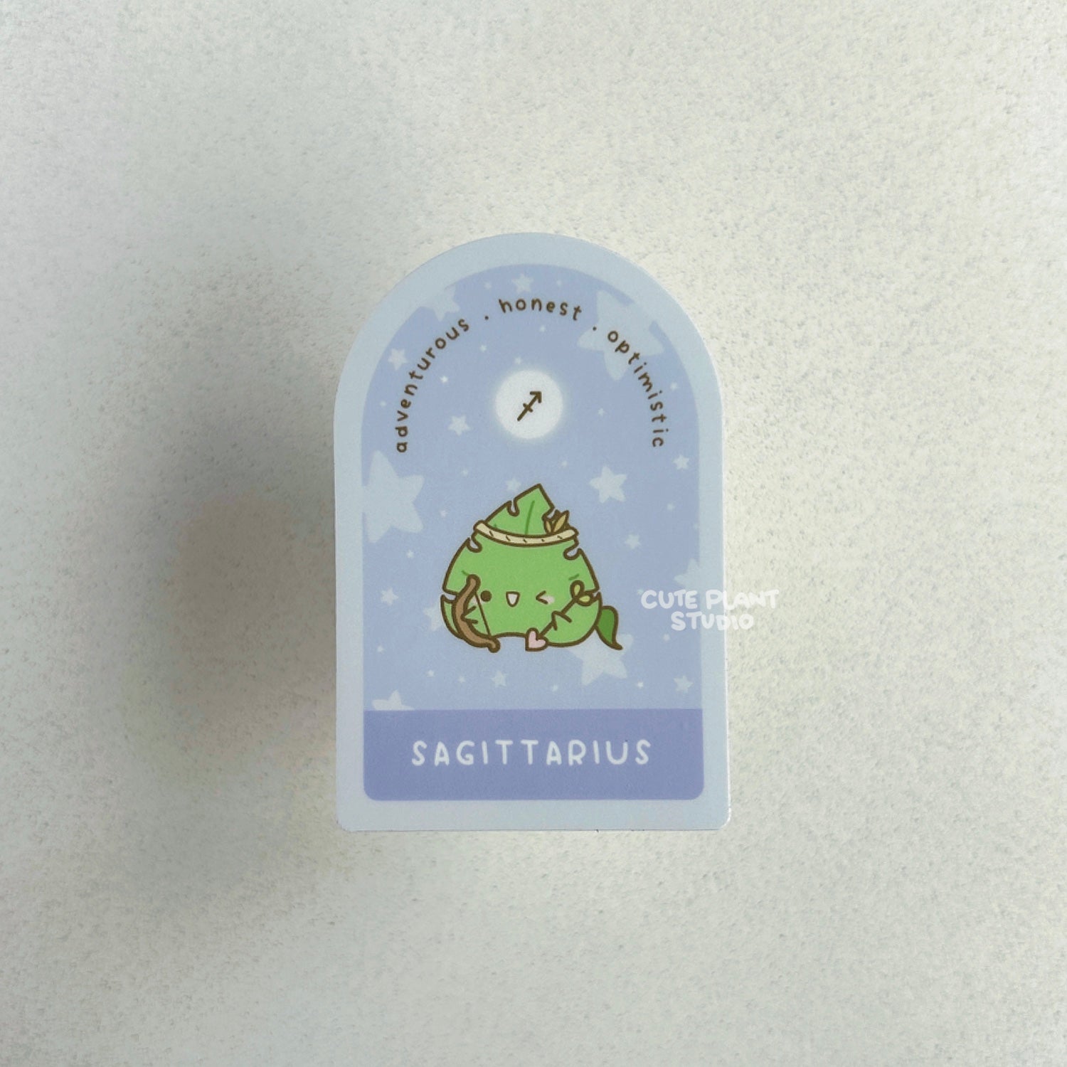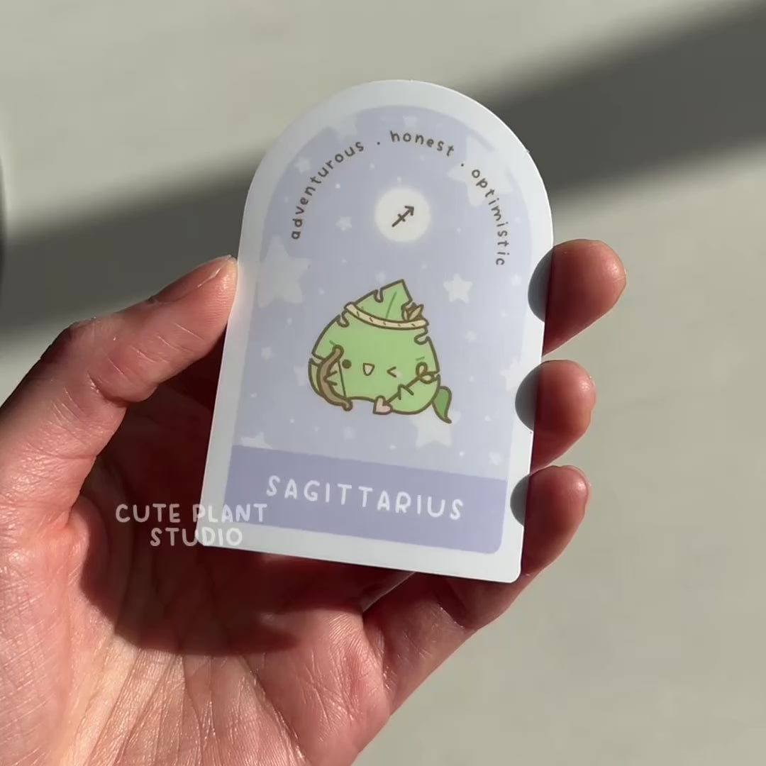 Adventurous and optimistic, our cute planty Sagittarius leaf wields a bow and arrow, perfect for exploring life’s possibilities. This eco-friendly zodiac sign sticker is approximately 3" (7.6cm) tall and is a fun way to express your horoscope pride! Durable, scratch-resistant, and waterproof, it's perfect for laptops, water bottles, or journals. A unique gift for houseplant parents and astrology fans alike!