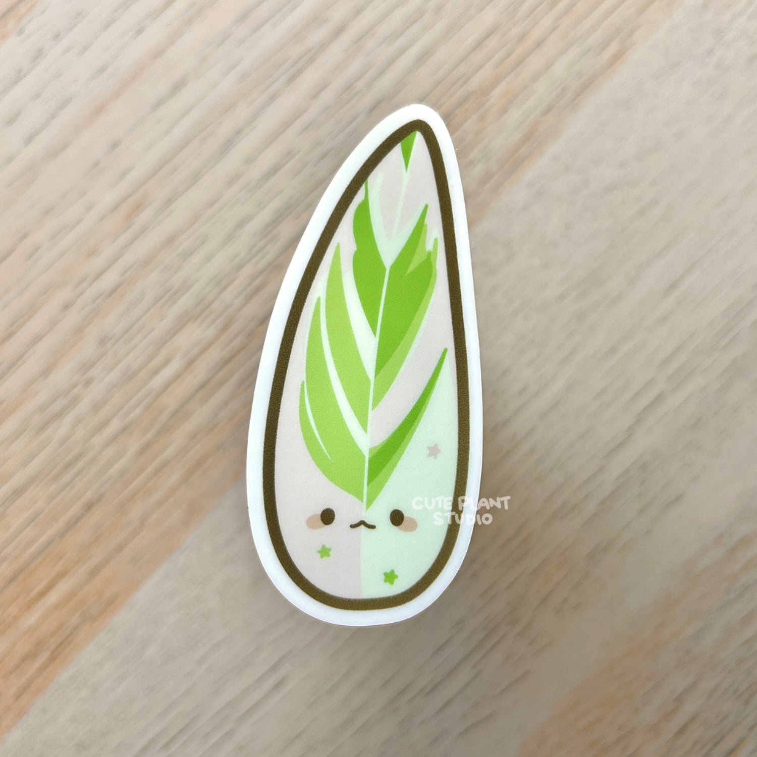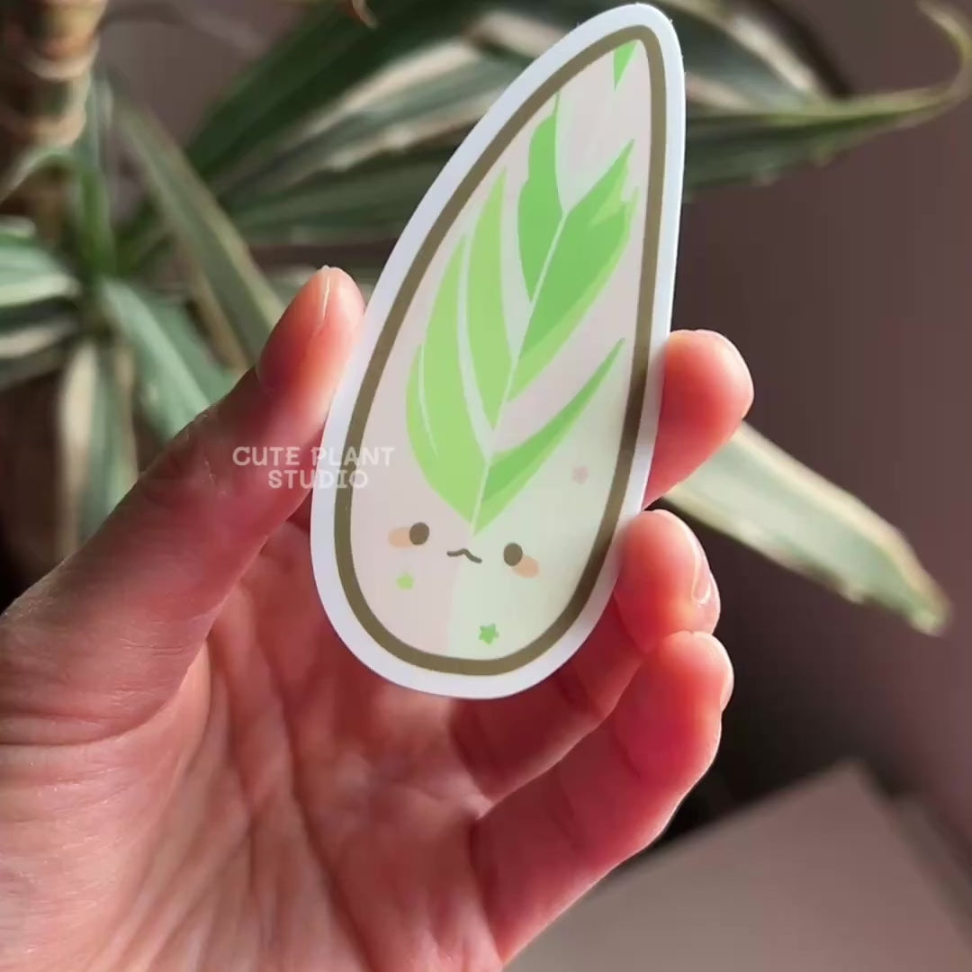 Three little stars for one iconic leaf! This Stromanthe Triostar sticker features a happy little face to match the stunning variegation. A perfect piece for fans of bold foliage and playful design. Stick it anywhere you need a pop of personality: water bottle, journal, or even slip it into your clear phone case! Waterproof, eco-friendly, and full of charm. Approximately 3" (7.6 cm) tall.