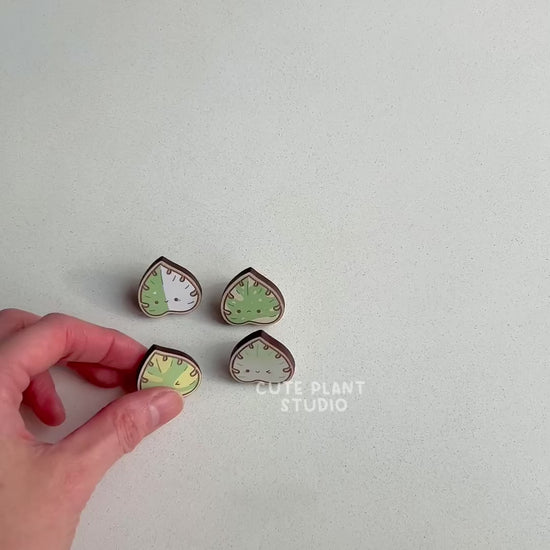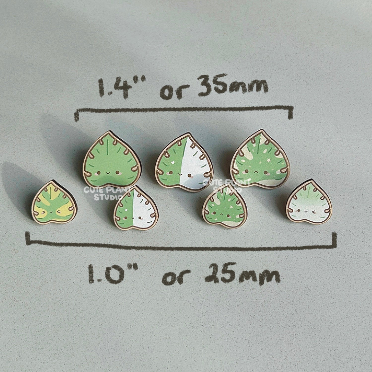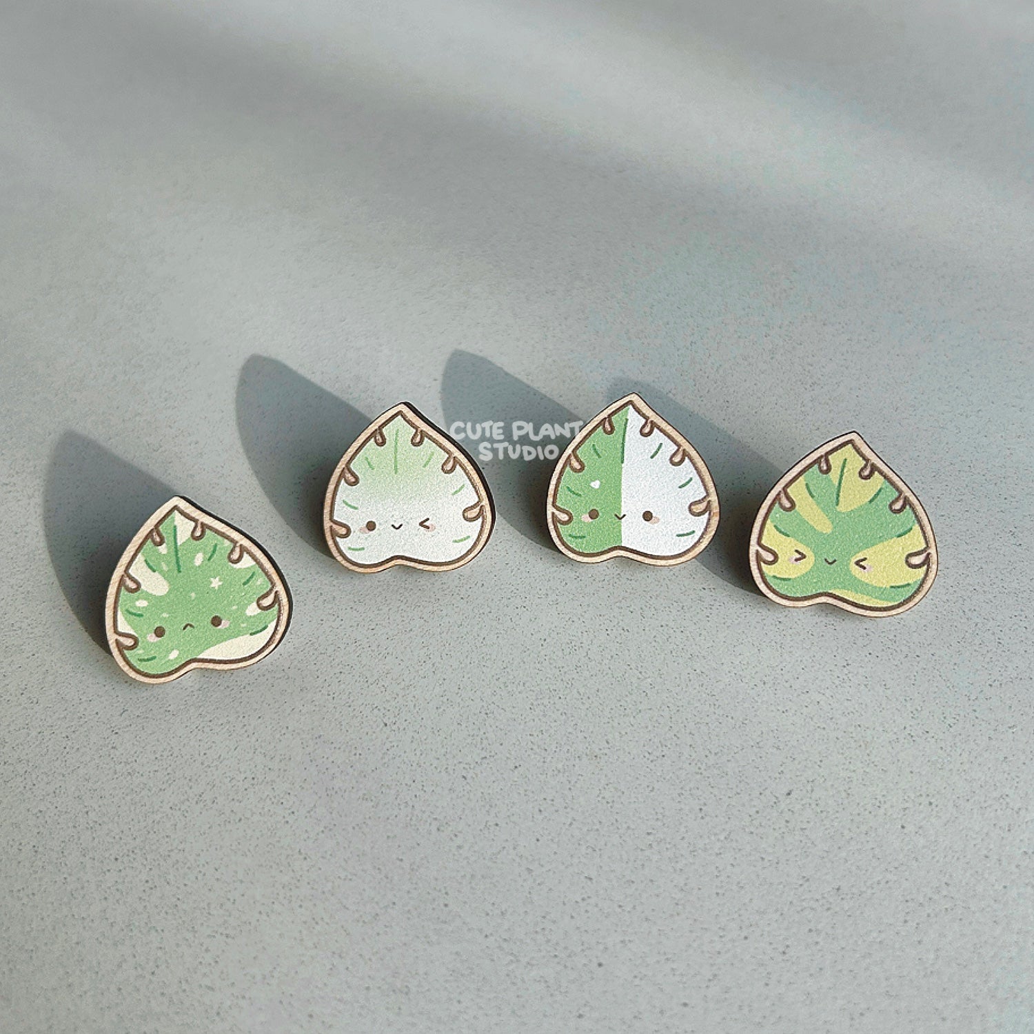 Show off your love for rare monstera varieties with this adorable Variegated Monstera wooden pin set! This 4-piece set features Albo, Aurea, Mint, and Thai Constellation, each perfectly sized at 1 inch (2.5 cm). These eco-friendly pins bring a kawaii vibe to your bags, hats, or jackets, making them a must-have for plant enthusiasts and collectors alike. Celebrate the beauty of variegation with these sustainable and charming accessories!